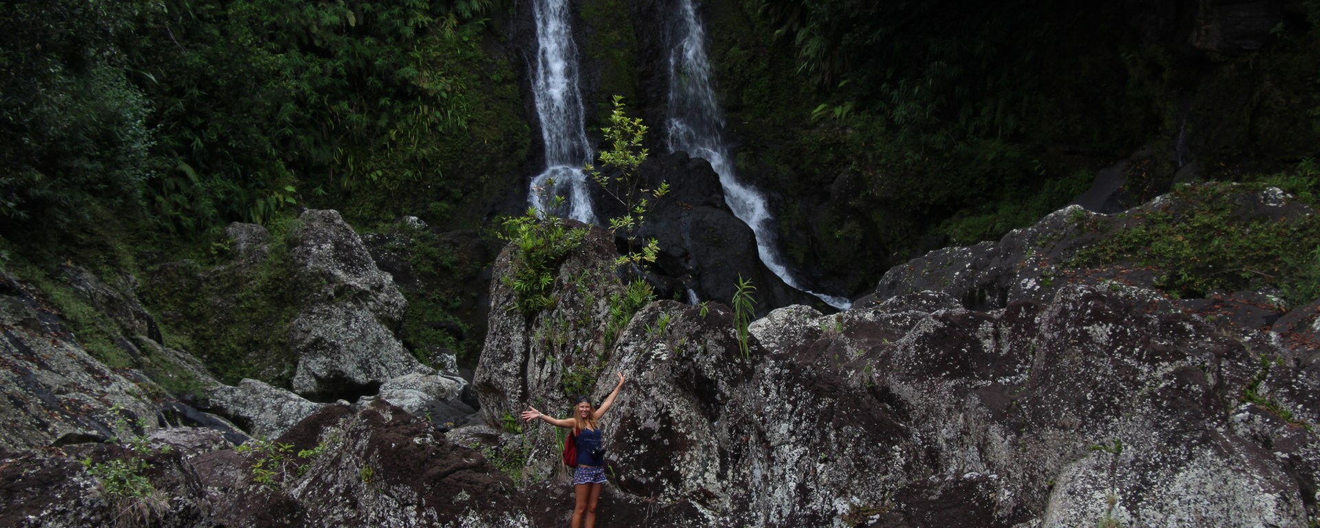 Direction le Bassin Pilon et non le Bassin Bœuf comme je l’ai cru au début. Il s’agit d’une randonnée qui demande peu d’efforts mais qui présente parfois des obstacles de taille : des indications de sentier bien cachées, de gros tuyaux qui font office de ponts, une échelle en fer fixée aux rochers ou encore un jet d’eau à traverser. Mais toutes ces péripéties ont été récompensées par les panoramas qui nous ont été offerts. Entre paysages aux allures de jungle tropicale et bassins surmontés de cascades, nous avons été agréablement surprises.